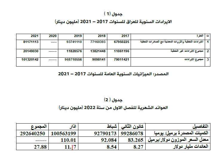 بلغت الايرادات النفطية لسنة 2017 ما يقارب 68 ترليون دينار فيما ارتفعت بمقدار عشرة ترليونات دينار لسنة 2018 لتصبح حوالي 77 ترليون دينار، وواصلت ارتفاعها في 2019 الى حوالي 94 ترليون دينار غير انها انخفضت الى 81 ترليونا في سنة 2021 ، علما انه لا توجد موازنة لسنة 2020 وكانت الايرادات النفطية لهذه السنة قد انخفضت الى حوالي 42 ترليونا بسبب انخفاض اسعار النفط والتي وصل سعر برميل النفط فيها الى ادنى مستوى له وهو 14 دولارا، في نيسان عام 2020، وذلك نظرا لانخفاض الطلب اثر شيوع جائحة كورونا وتوقف النشاط الاقتصادي في اغلب المصانع وحركة الطيران التي تستهلك 11 مليون برميل يوميا. اما الايرادات النفطية للفصل الاول من عام 2022 فقد بلغت 27.88 مليار دولار لثلاثة اشهر وبمعدل سعر 83.3 دولار للبرميل الواحد لشهر كانون الثاني من عام 2022، فيما اصبح سعر البيع لشهر شباط 92.1 دولار للبرميل، وفي اعقاب الحرب الروسية – الاوكرانية ارتفعت الاسعار الى رقم تجاوز 100 دولار صعودا ونزولا مع اشتداد وهدوء الازمة الاوكرانية.
