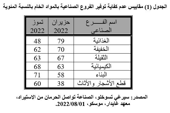الجدول (1) مقاييس عدم كفاية توفير الفروع الصناعية بالمواد الخام بالنسبة المئوية