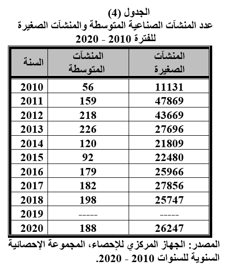 القطاع الصناعي وهو القطاع الذي كان يعمل في زمن الحصار، فما الذي يدعو الى توقف هذا القطاع المتميز بمنتجاته على مر السنين، وليس هناك رؤى لتشغيله، فهل النمو يحصل لقطاع اوقف بإصرار. حيث واجه القطاع الصناعي تحديا واضحا وكبيرا خلال الفترة التي اعقبت فترة الاحتلال، إذ اهمل هذا القطاع بتعمد وذلك بتأييد ودعم من جهات واطراف متعددة لها اذرع مسلحة، تقف حائلا دون السماح لأي طرف بالتدخل لمصلحة هذا القطاع. وقد شمل هذا الاهمال كلا من القطاعات الحكومية والخاصة و كذلك المنشآت الصغيرة. وكان اعلى عدد للمنشآت الكبيرة هو (682) منشأه في سنة 2020، تتوزع بين القطاعات الثلاث منها (619) منشأه للقطاع الخاص. ويبين الجدول (3) والجدول (4) عدد هذه الشركات حسب إحجامها وقطاعاتها. ومن الجدير بالإشارة ان مساهمة القطاع الصناعي في الناتج المحلي الاجمالي للسنوات الثلاث 2018 و2019 و2020 بحدود 2.0% و2.1% و 2.7% على التوالي في حين كانت مع وجود الحصار نسبة المساهمة 12%، وان هذا القطاع ممكن ان ينهض من كبوته لو تمت ادارته من عناصر كفوءة ووطنية.
