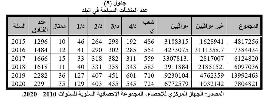 4 – قطاع السياحة: توجد مواقع سياحة وآثارية وتاريخية في العراق من شماله حتى جنوبه وهناك ورغبة لدى الكثير من السائحين لزيارة تلك المواقع لو توفر لها الامن والخدمات السياحية. ولو حصل فيها اهتمام من قبل الدوائر ذات العلاقة شريطة توفير الامن مع توفر الخدمات السياحية التي يحتاجها السائح، لوفرت هذه المواقع ايرادات للدولة تقارب الايرادات النفطية، ولكن تعرض العراق على مدى يزيد على الاربعين عاما الى الحروب والازمات السياسية والاقتصادية والحصار وقد اثر ذلك كثيرا عليه سياسيا واقتصاديا واجتماعيا لأن كل هذه الجوانب مترابطة ومؤثرة بعضها على البعض الآخر، الامر الذي انعكس على الاقتصاد الوطني بكل قطاعاته ومنها بالتحديد قطاع السياحة الذي يعتمد على توفر الامن اولا والخدمات السياحية التي يحتاج اليها السائح. ويوضح الجدول (5) اعداد الفنادق السياحية بدرجاتها المختلفة حيث كانت الفنادق ذات الدرجة الممتازة اقلها عددا لكنها اصبحت 35 فندقا سنة 2020 بعد ان كانت 10 فنادق سنة 2015 رغم تنشيط السياحة نسبيا حيث تحتاج السياحة الى الاستقرار الامني والسياسي، وهما عنصران ما زالا قلقان بحيث البيئة السياحية ليست جاذبة كما يجب. اما الفنادق ذات الدرجات الاقل من د/1 – د /4 او الشعبية فأعداها اكبر، في حين بلغ عدد السياح من عراقيين وعرب وأجانب اعلى عدد سنة 2019 وهي السنة التي سبقت وباء كورونا؛ اذ بلغ عدد السياح لهذه السنة (13,992,463) سائح. ويمكن ان تزداد الاعداد اذا توفر الاستقرار الامني والسياسي مع تحسين الخدمة الفندقية .