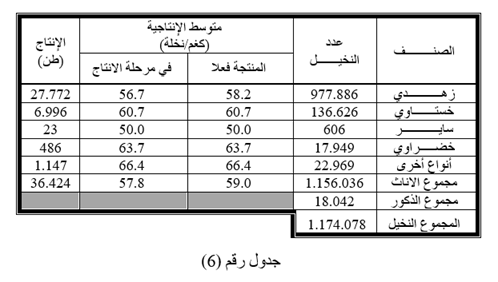 علما ان مجموع النخيل في المحافظة لعام 2006 كان 655.639 نخلة، وإنتاج 38.849 ومتوسط إنتاجية بلغ 65.0 كغم/ نخلة(12). اما عام 2014 فكان 691.810 نخلة، ومجموع انتاج التمور للعام ذاته كان 44.961 طنا بمعدل انتاج 84 كغم/ نخلة.